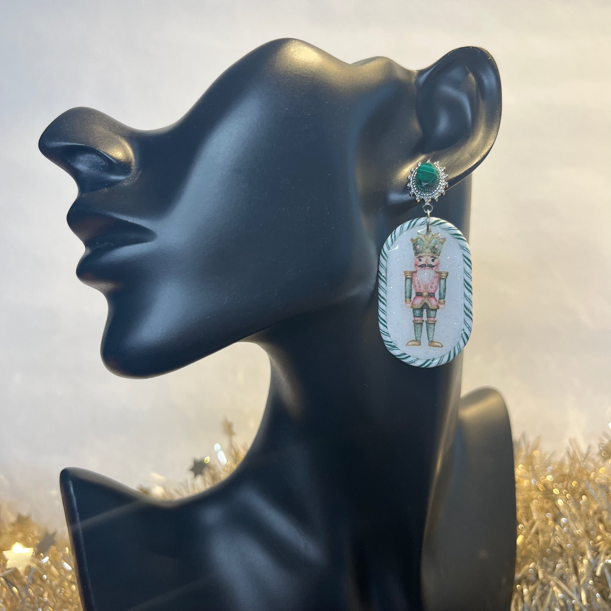 Matériau : argile polymère, finition en résine, clous d'oreille en acier inoxydable et malachite.