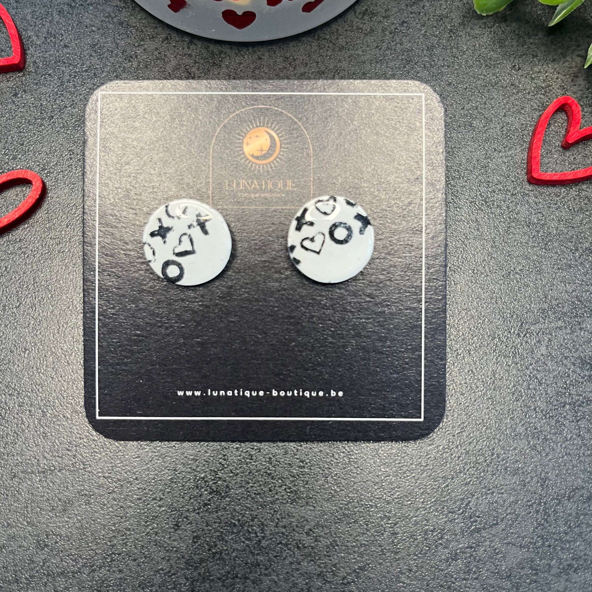 Matériau : argile polymère, finition en résine, clous d'oreille en acier inoxydable.