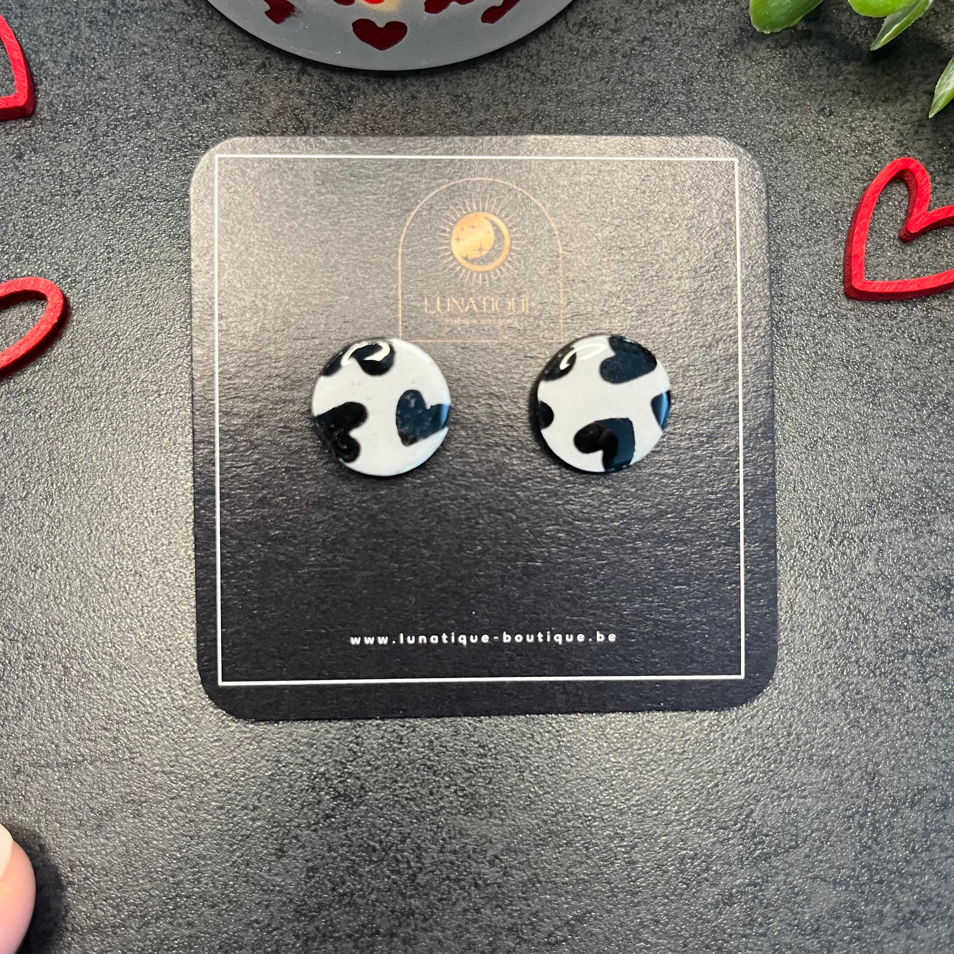 Matériau : argile polymère, finition en résine, clous d'oreille en acier inoxydable.