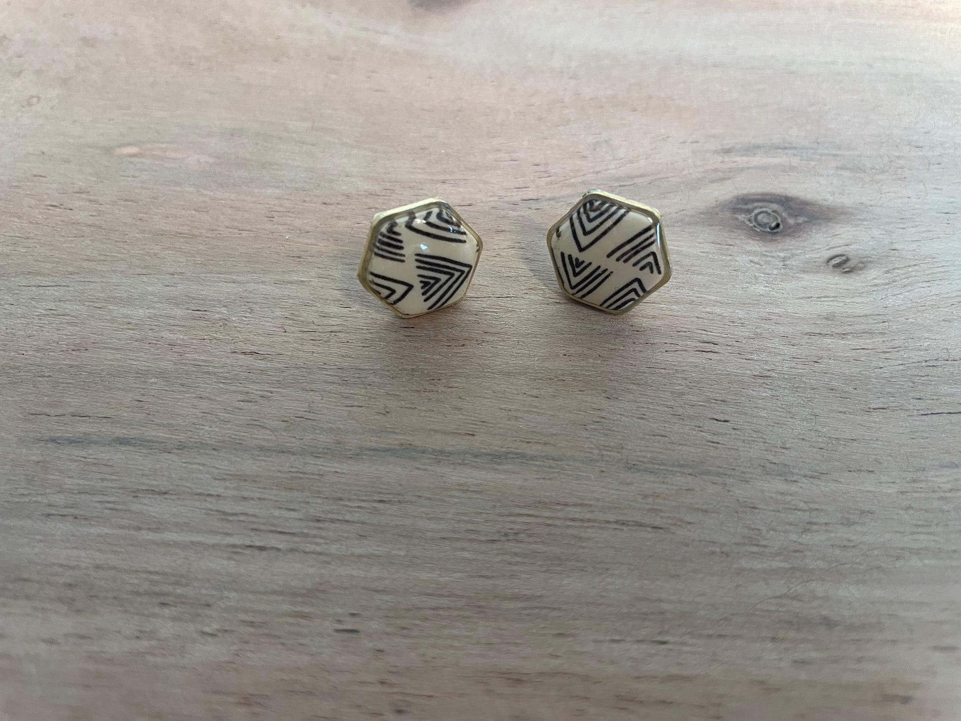 Matériau : argile polymère, hexagone en laiton brut, clous d'oreilles dorés à l'or fin, finition en résine.