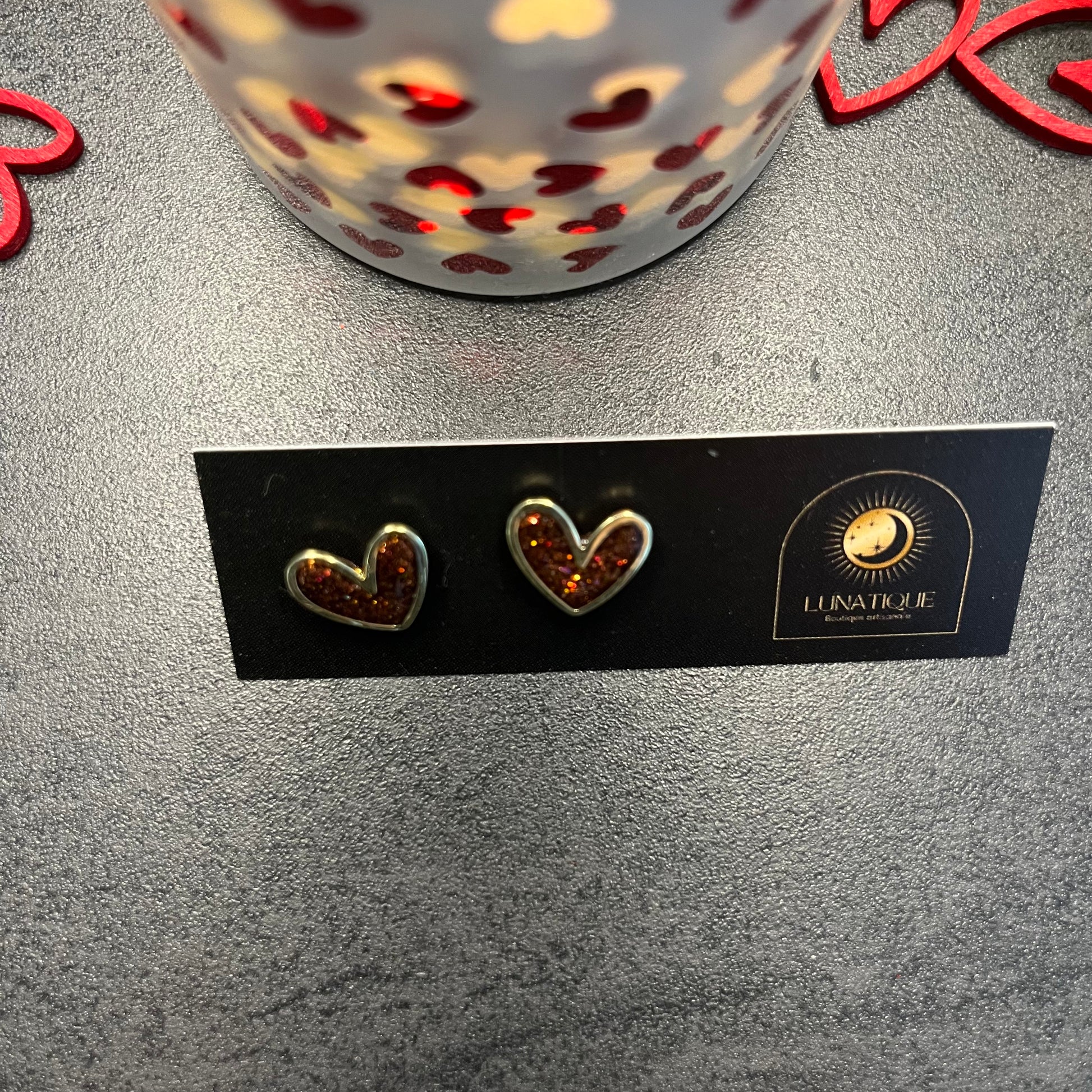 Matériau : argile polymère, cerclage en or, finition résine et paillettes, clous d'oreille en acier inoxydable.