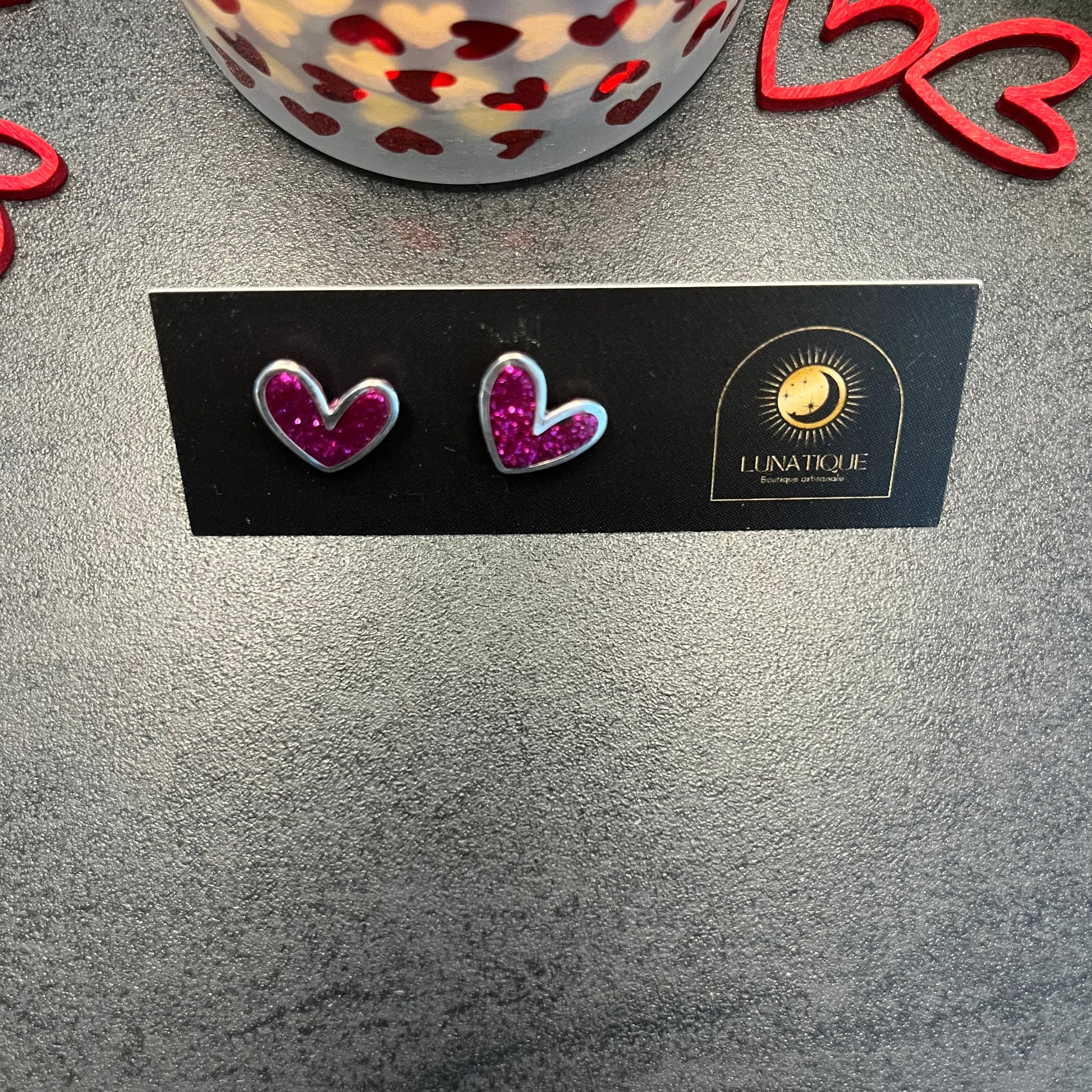 Matériau : argile polymère, cerclage en argent, finition résine et paillettes, clous d'oreille en acier inoxydable.