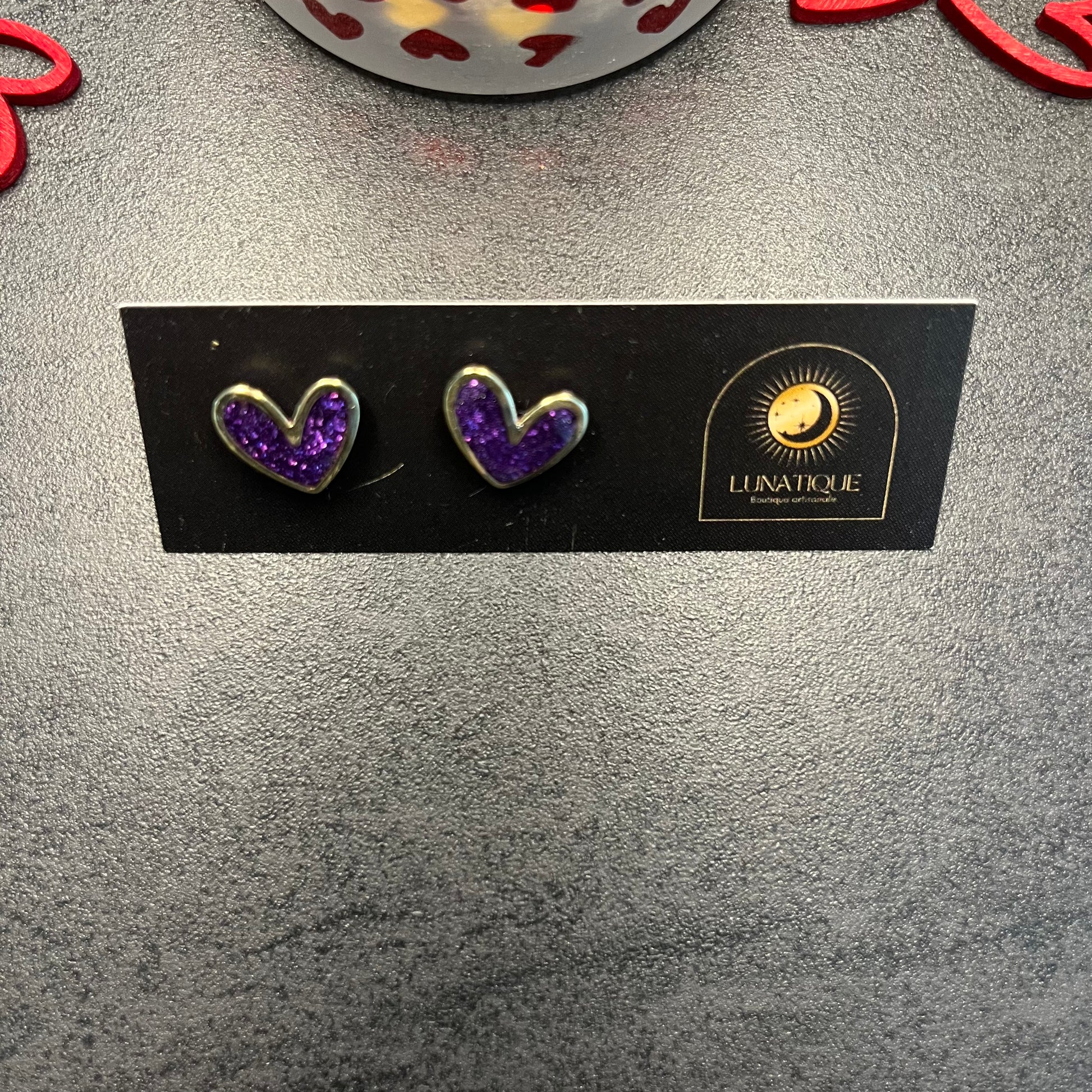 Matériau : argile polymère, cerclage en or, finition résine et paillettes, clous d'oreille en acier inoxydable.