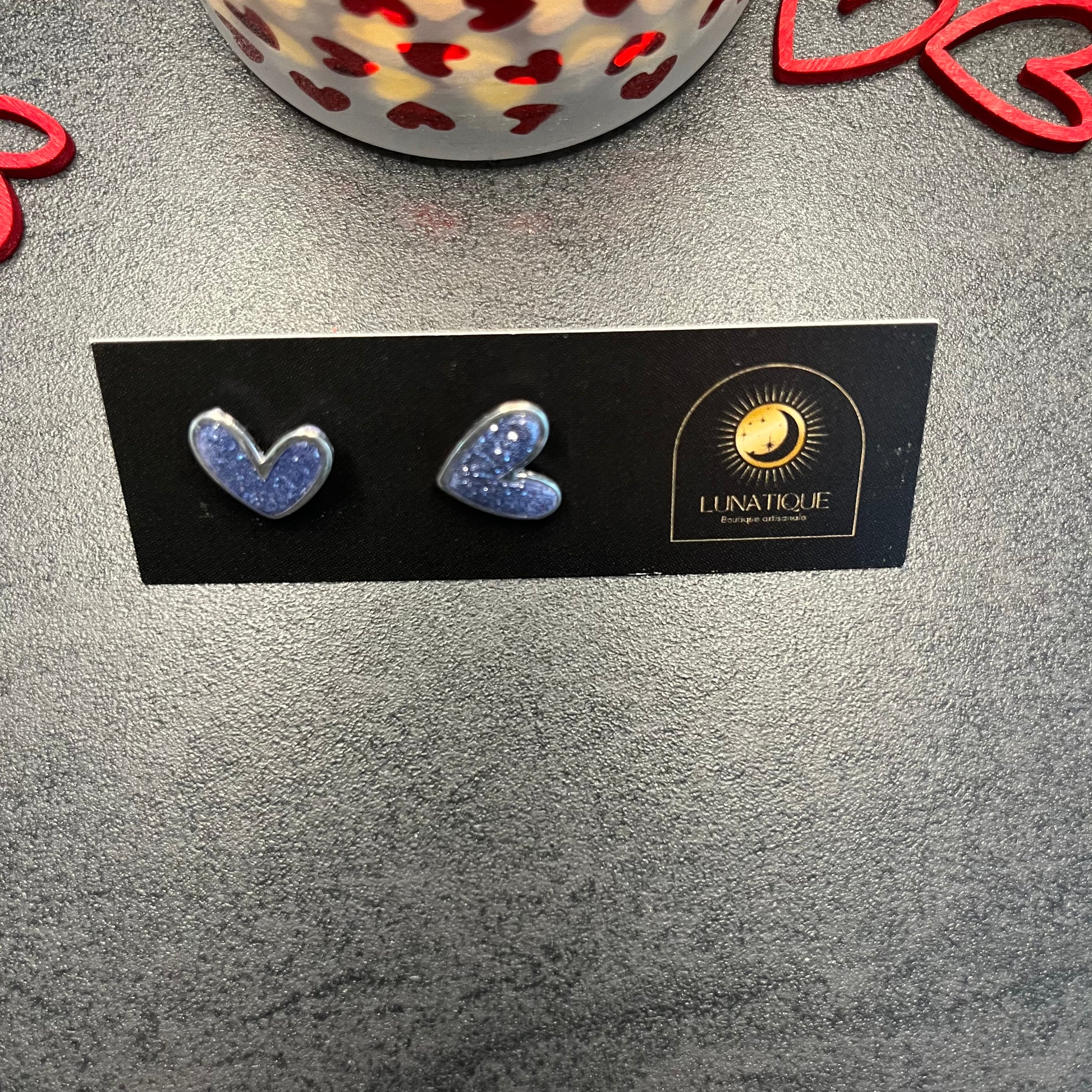 Matériau : argile polymère, cerclage en argent, finition résine et paillettes, clous d'oreille en acier inoxydable.
