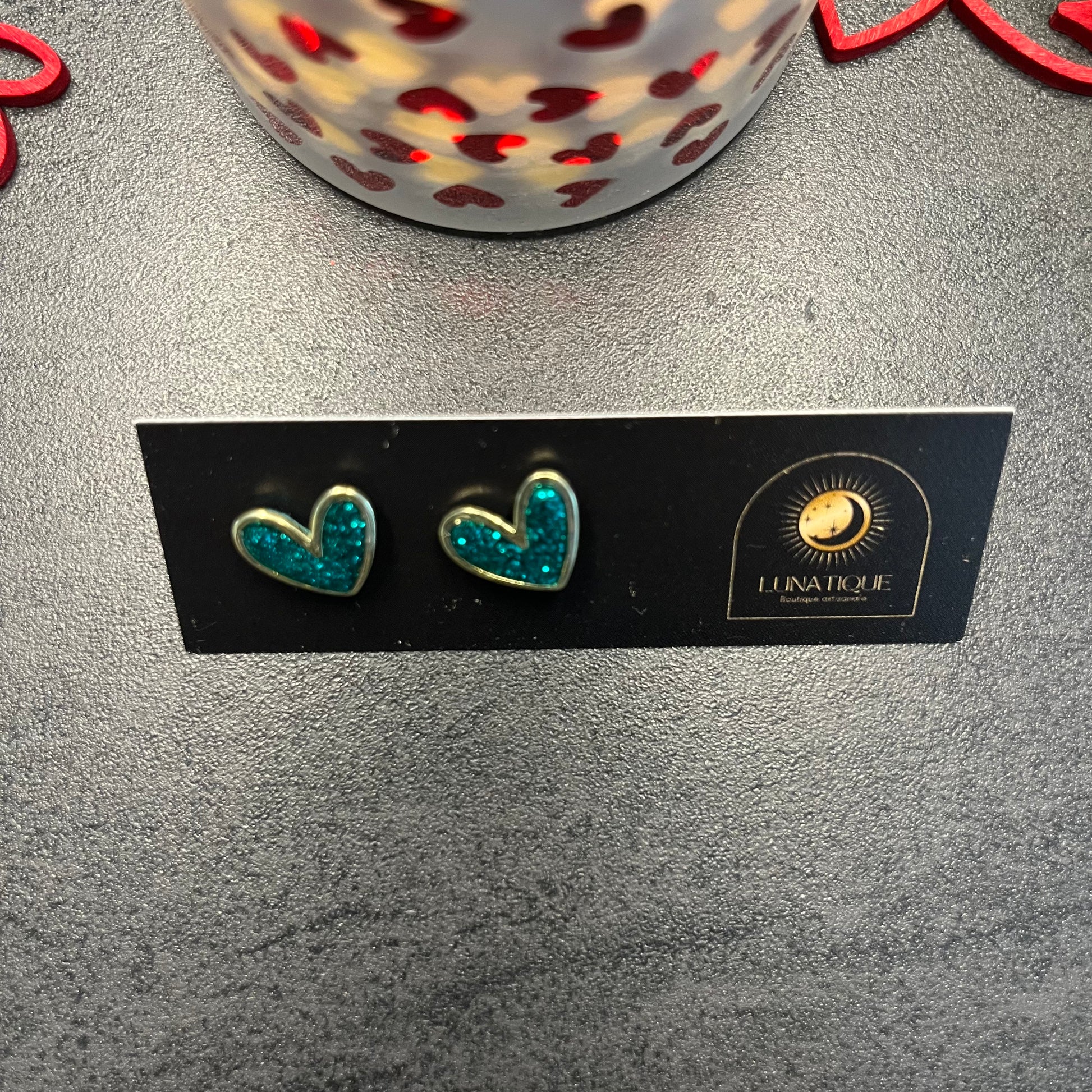 Matériau : argile polymère, cerclage en or, finition résine et paillettes, clous d'oreille en acier inoxydable.