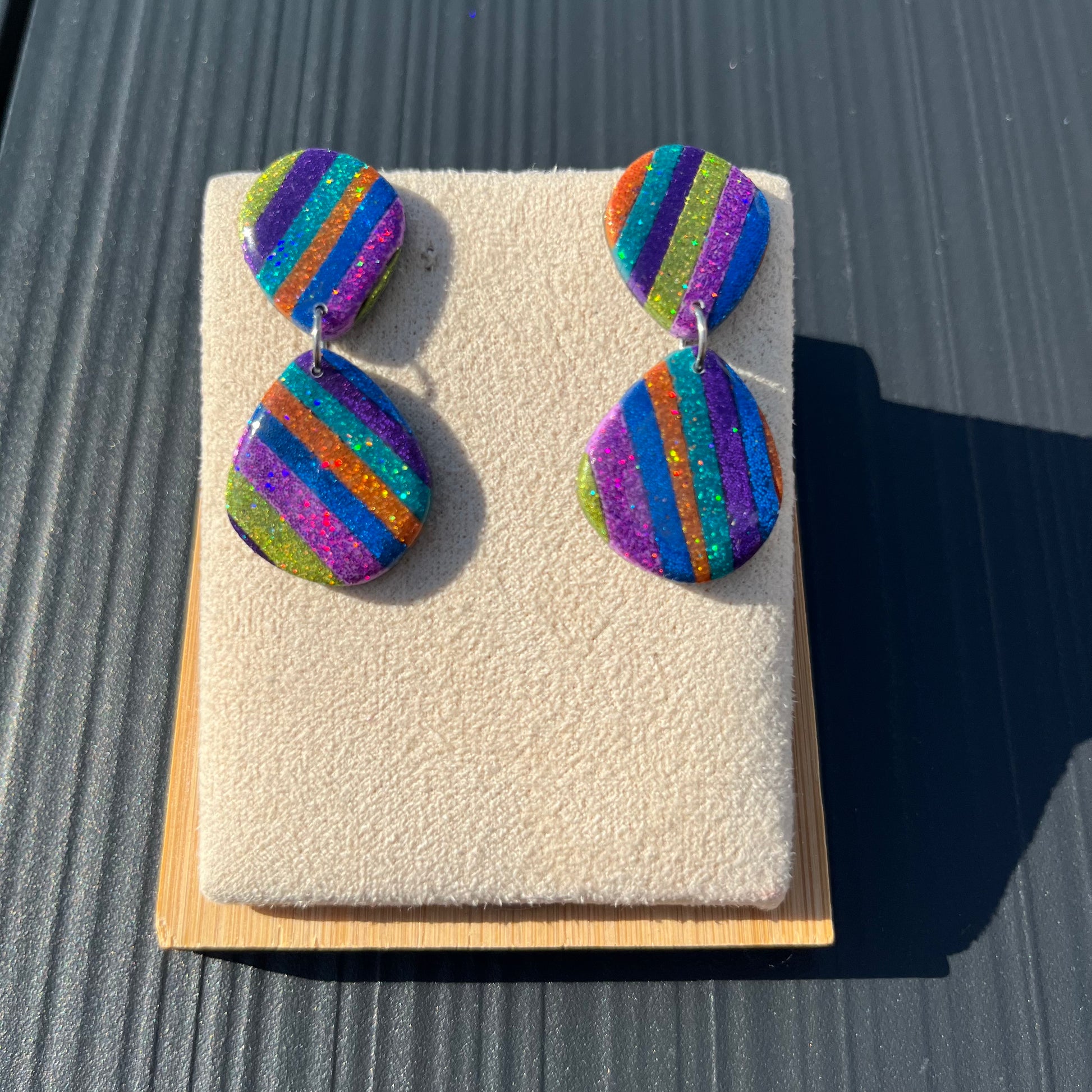 Matériau : argile polymère pailletée. Finition en résine. Clous d'oreille en argent.