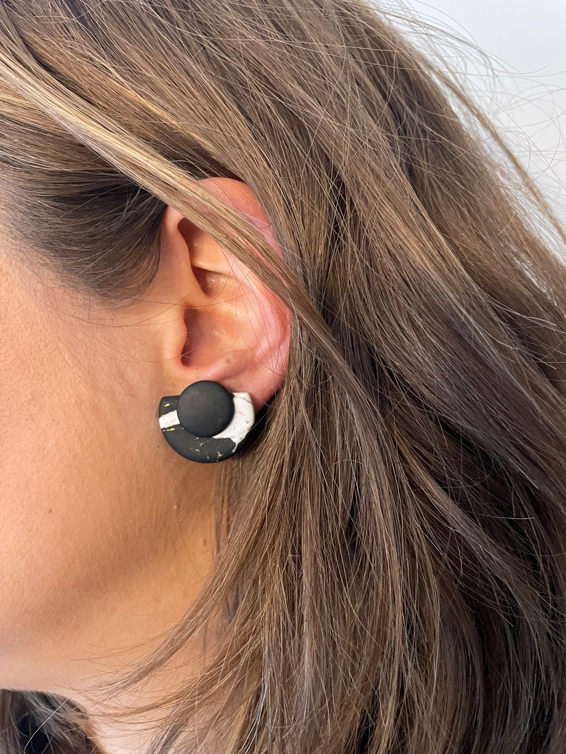 Matériau : argile polymère, feuille d'or, clous d'oreille en argent.