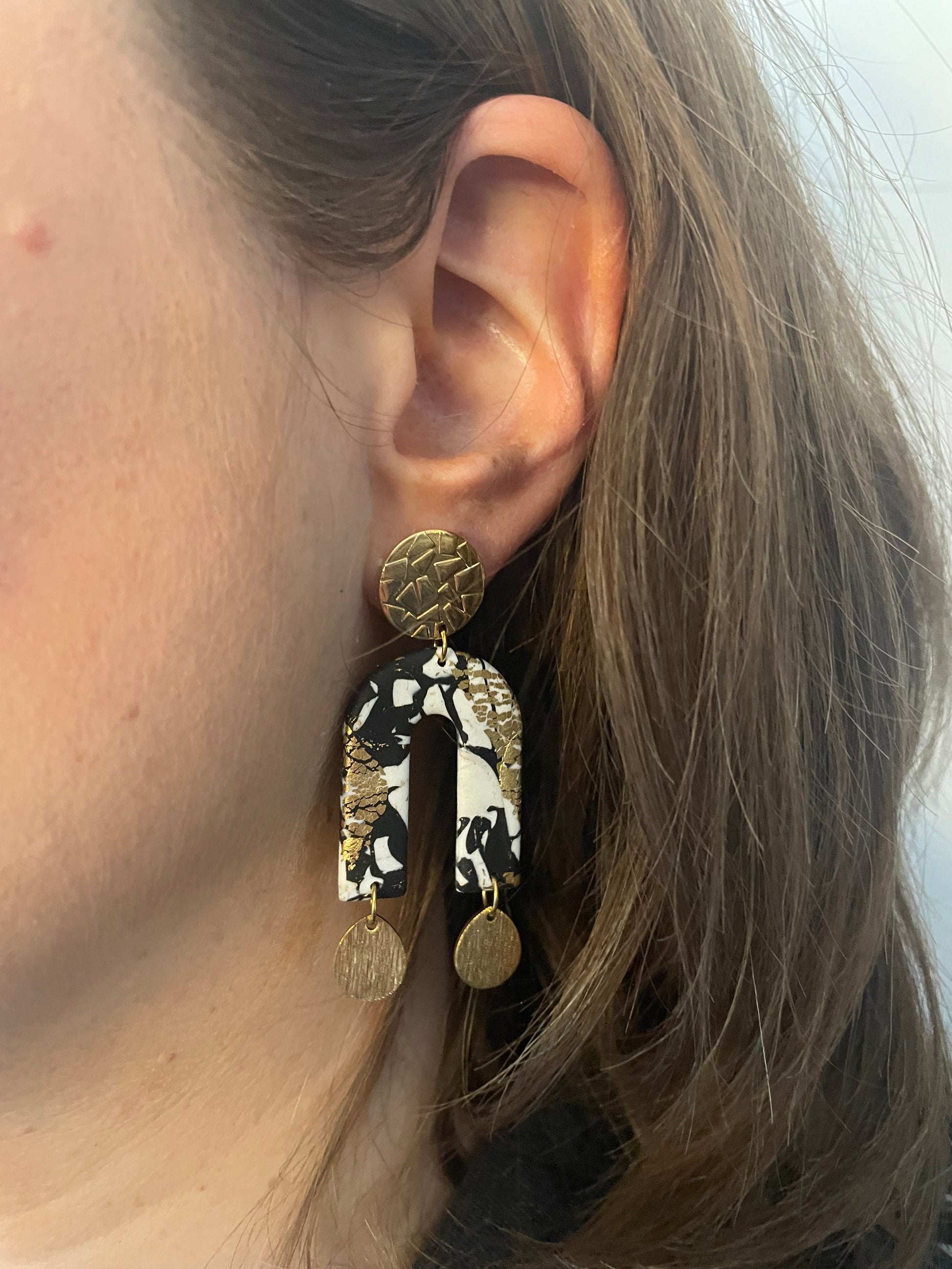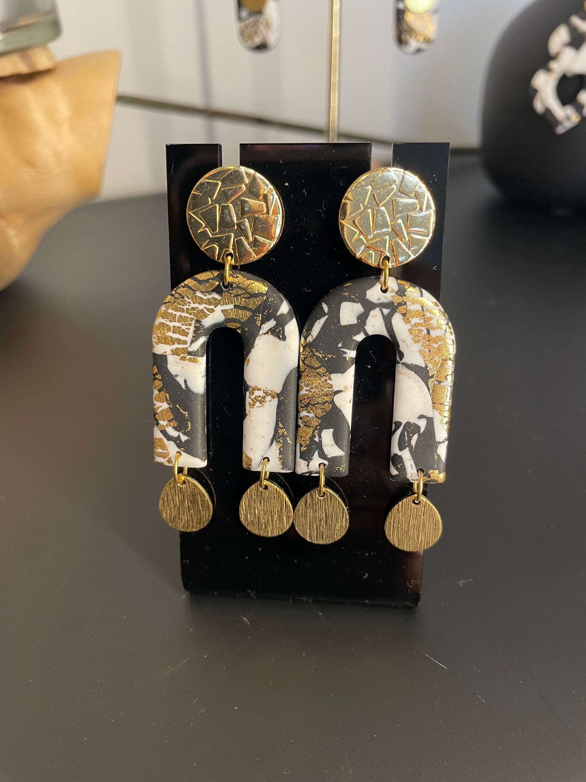Matériau : argile polymère, feuille d'or, breloques et clous d'oreille dorés à l'or fin.