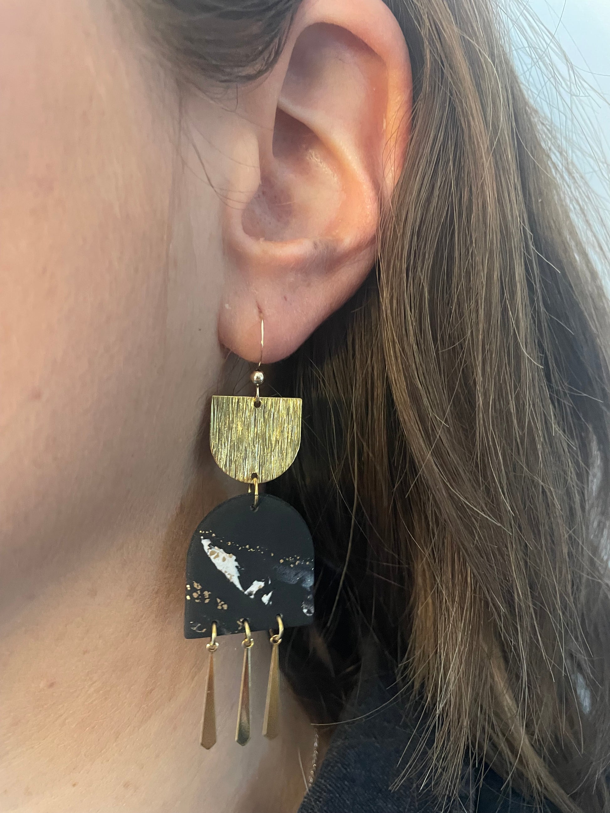 Matériau : argile polymère, feuille d'or, breloques, connecteur et crochets d'oreille dorés à l'or fin.