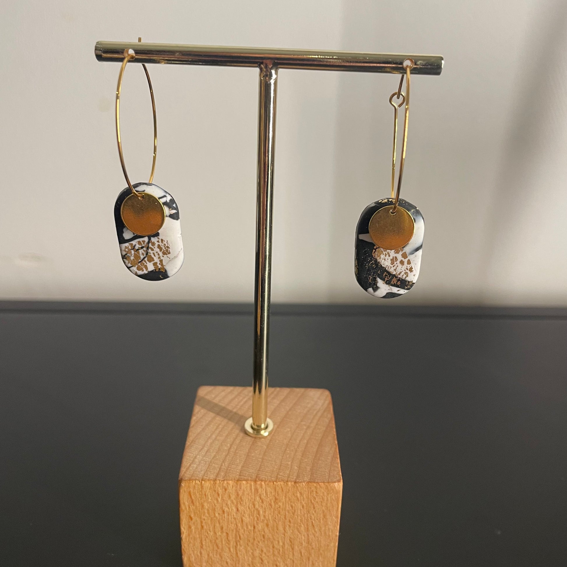 Matériau : argile polymère, feuille d'or, breloques et créoles clous dorés à l'or fin.