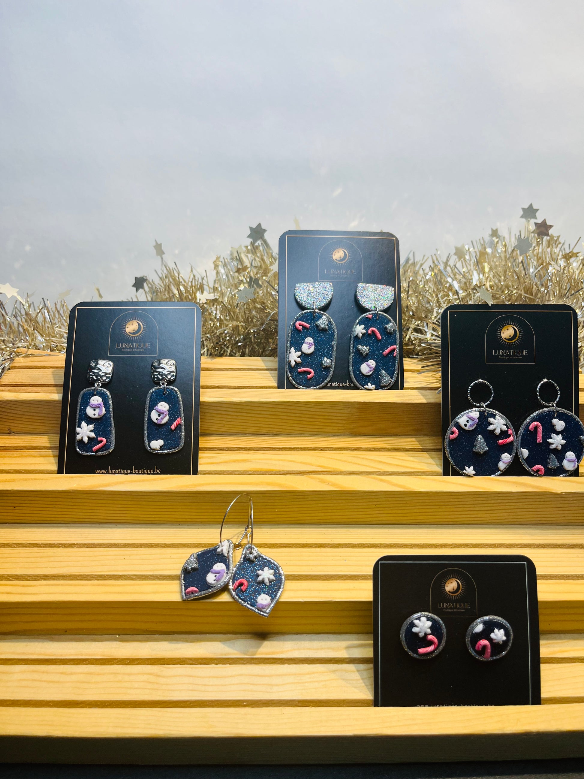 Matériau : argile polymère, finition en paillettes, clous d'oreille en acier inoxydable.