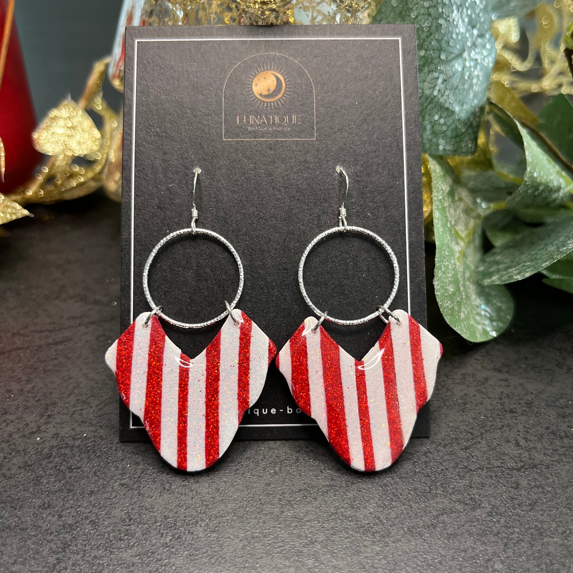 Matériau : argile polymère, finition paillettes et résine, anneau de montage en argent, crochet en argent.