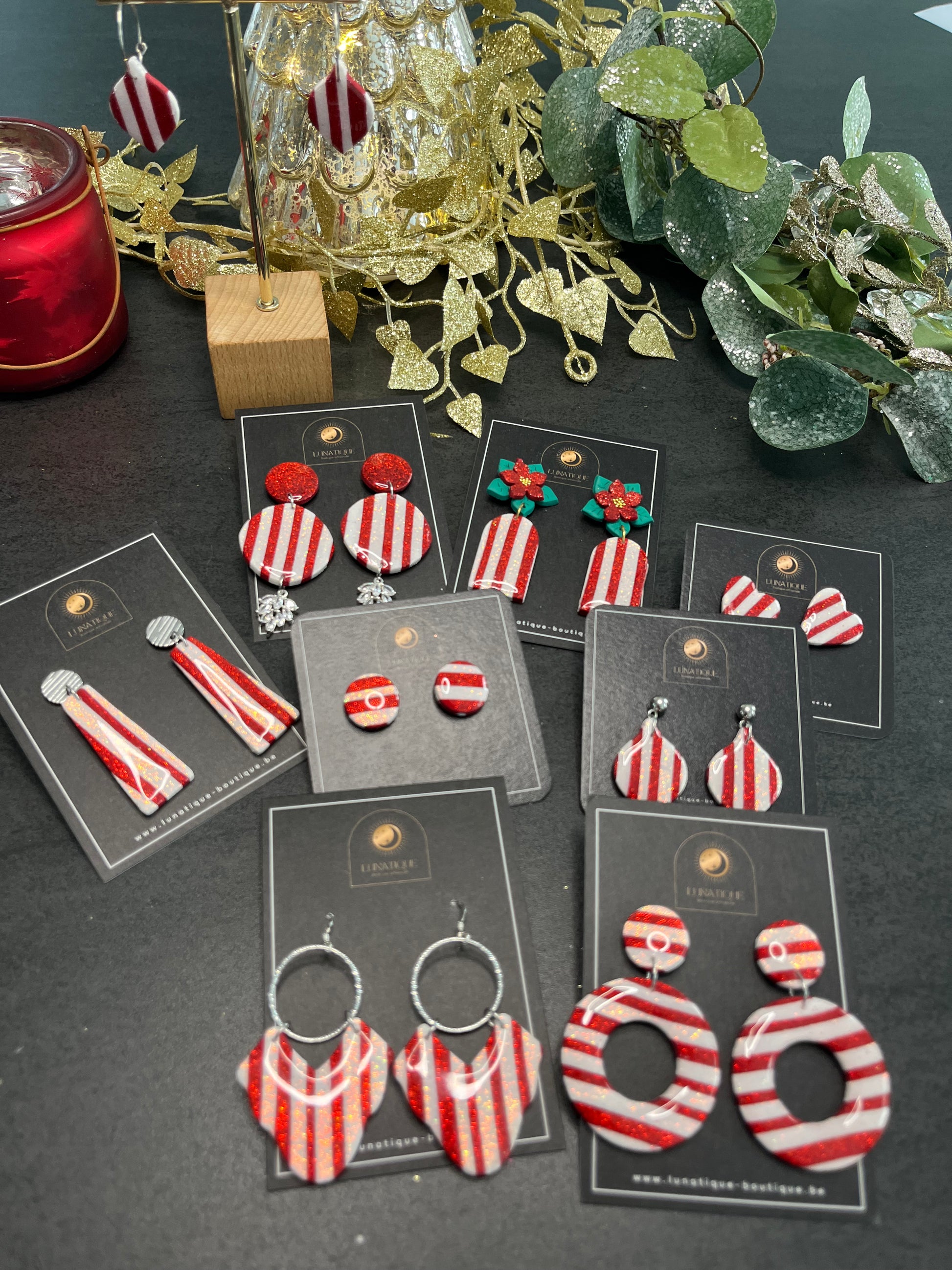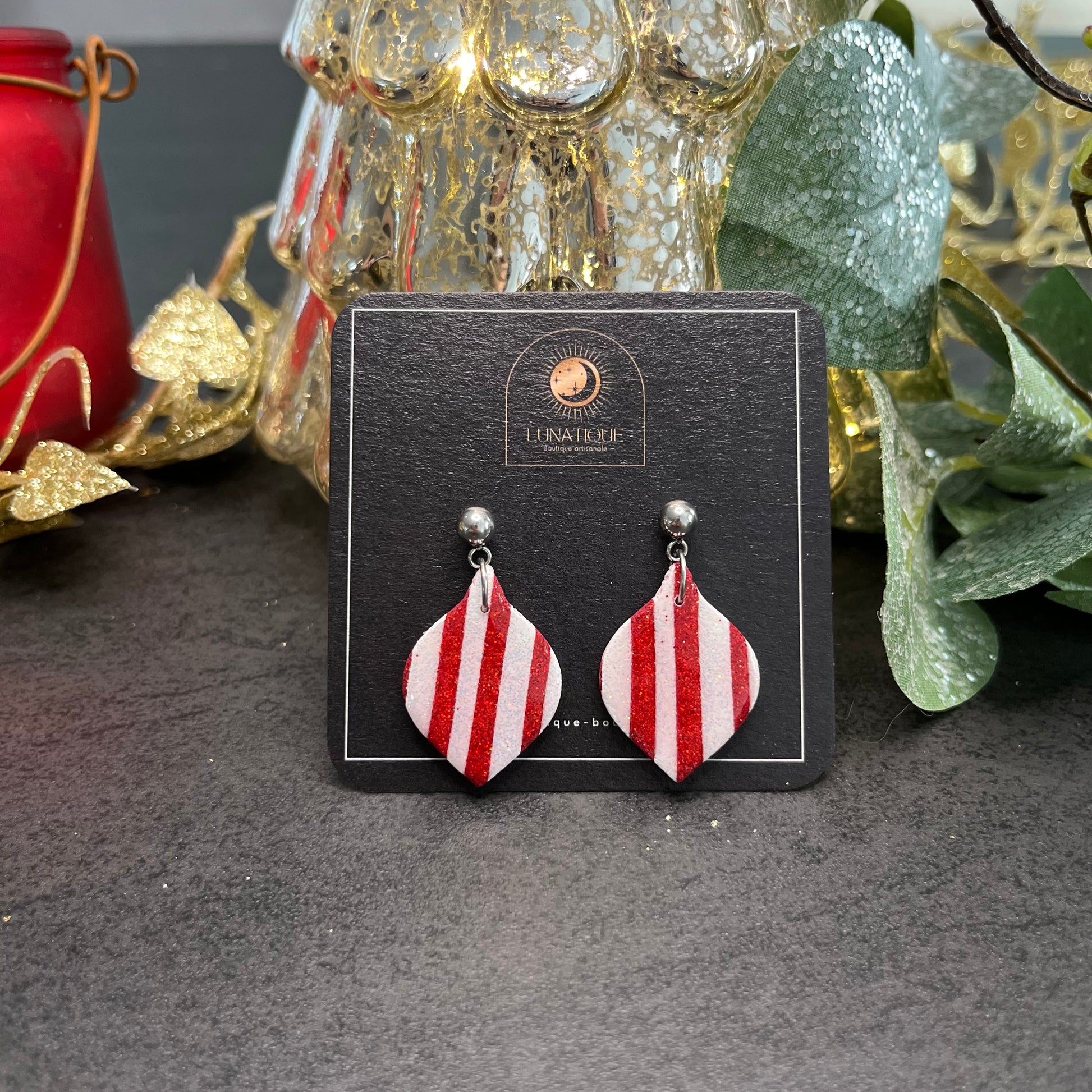 Matériau : argile polymère, finition paillettes et résine, clous d'oreille en acier inoxydable.