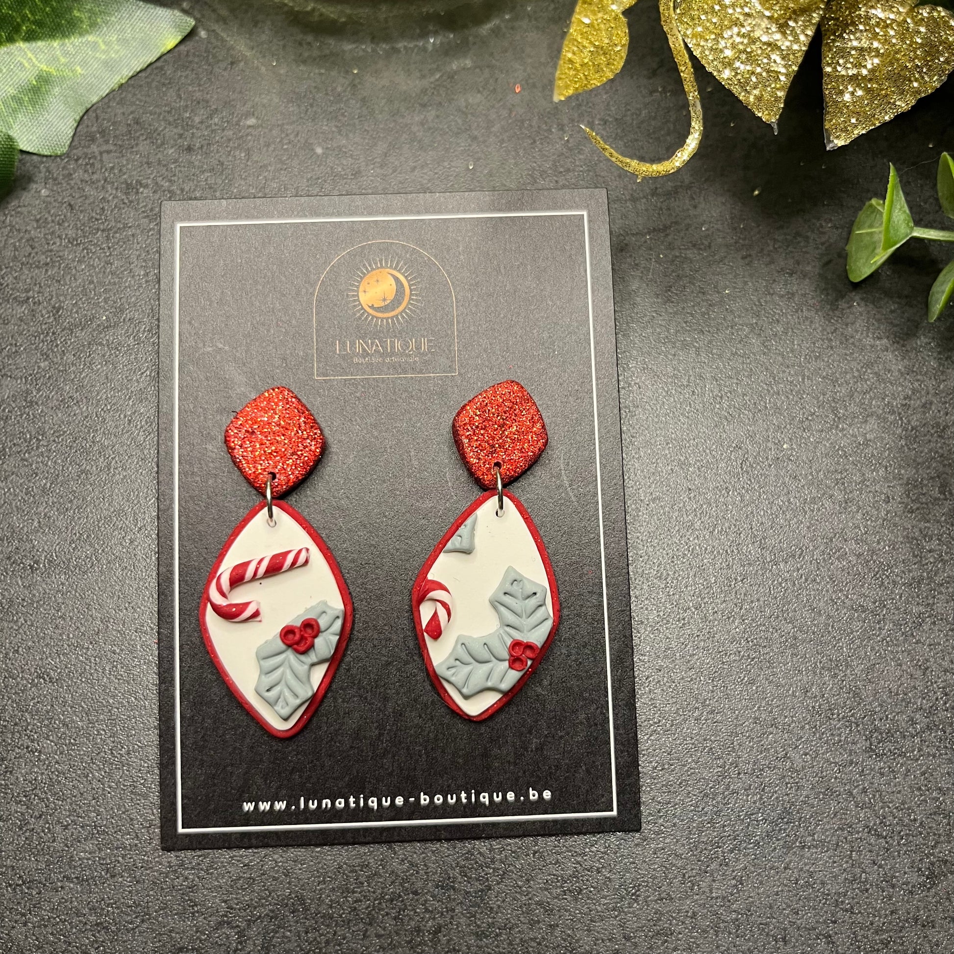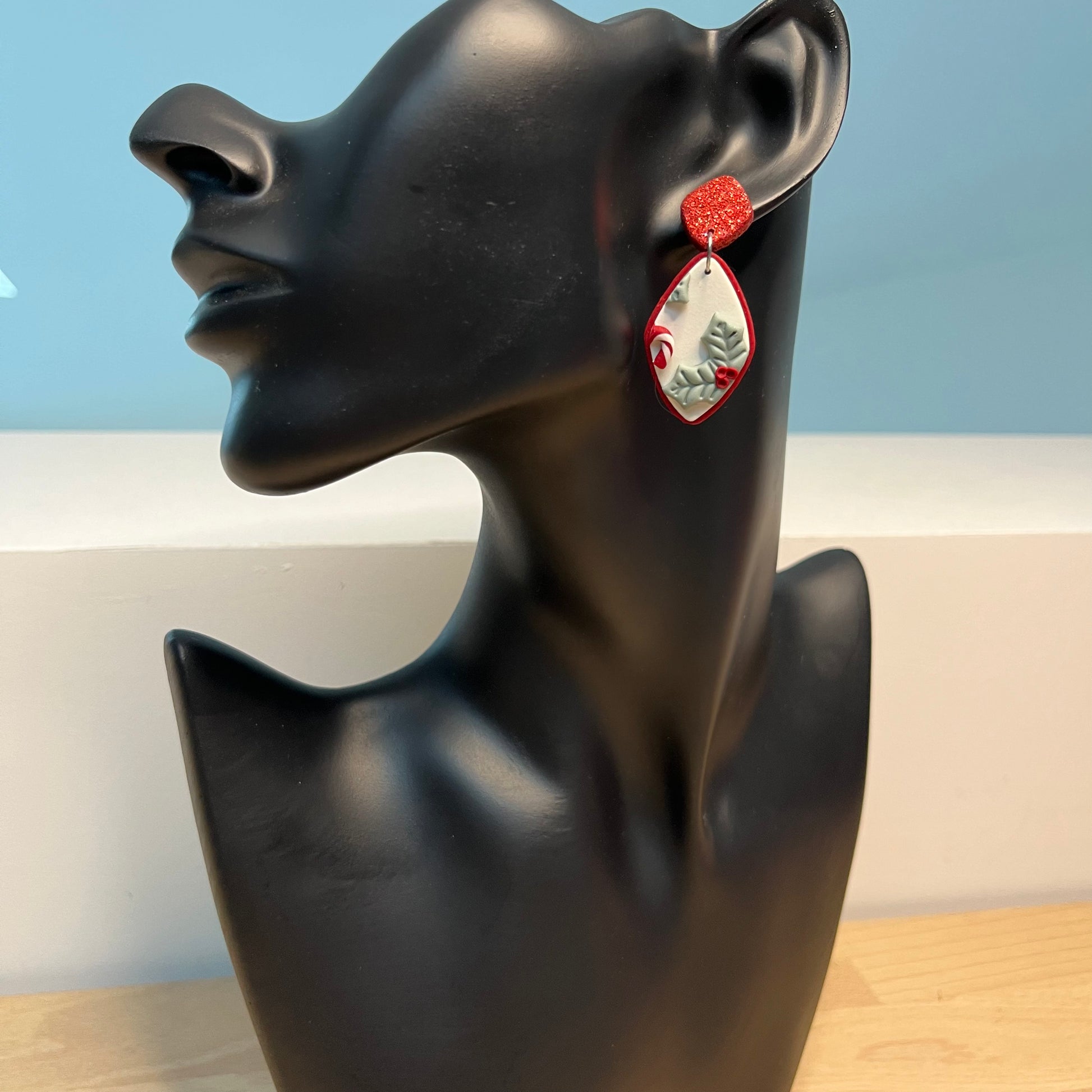 Matériau : argile polymère, vernis de protection, clous d'oreille en bois et en acier inoxydable.
