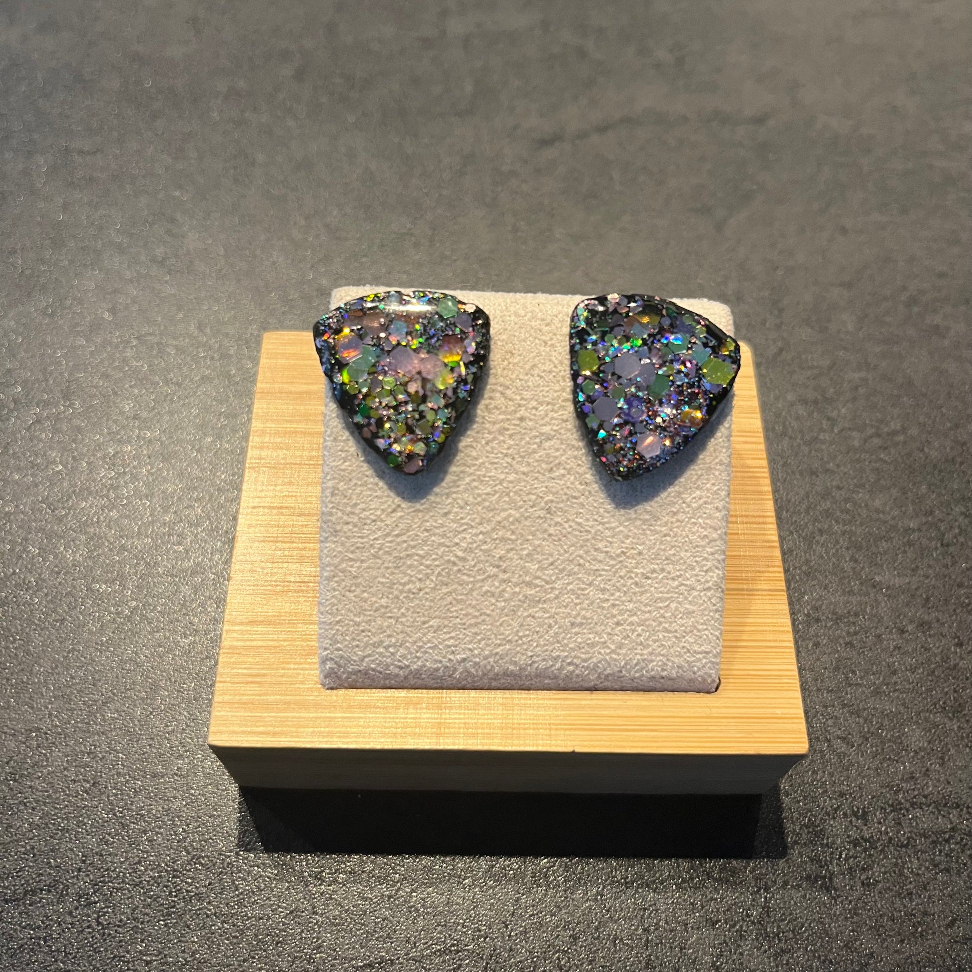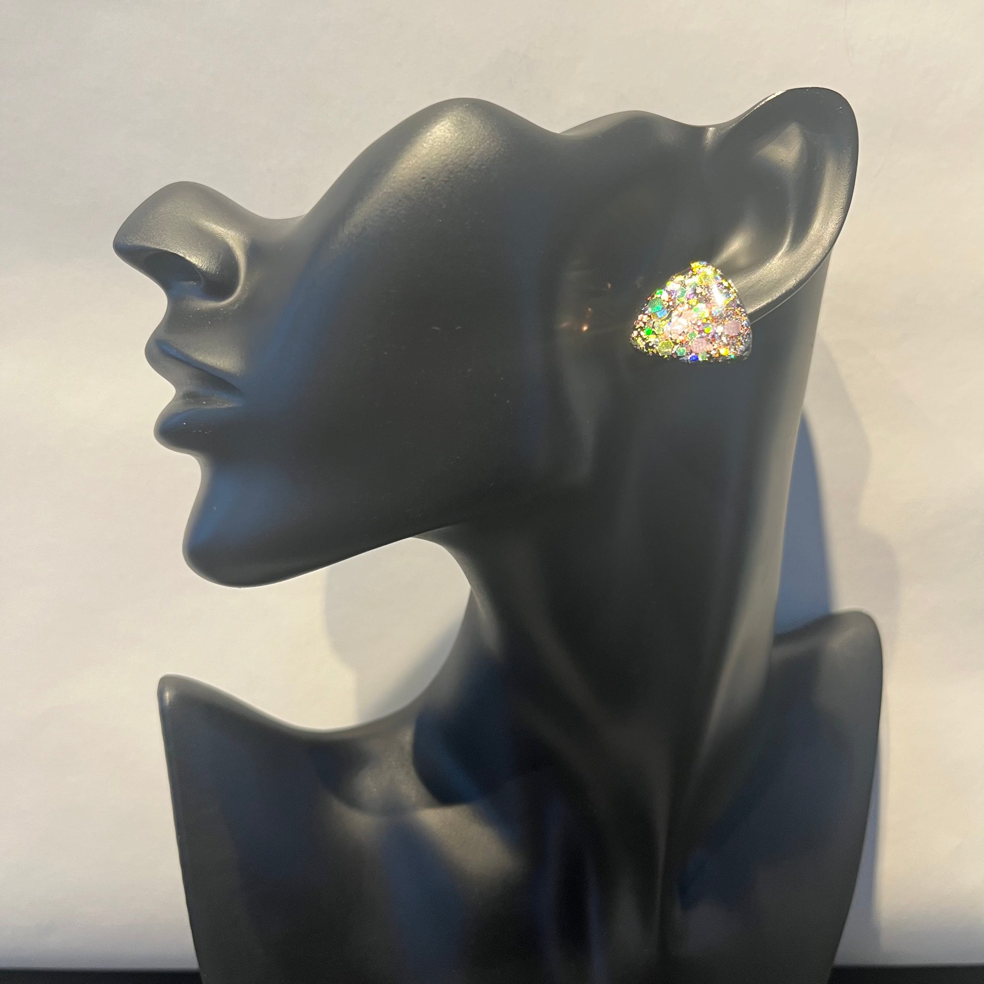 Matériau : argile polymère, finition en résine, clous d'oreille en acier inoxydable.