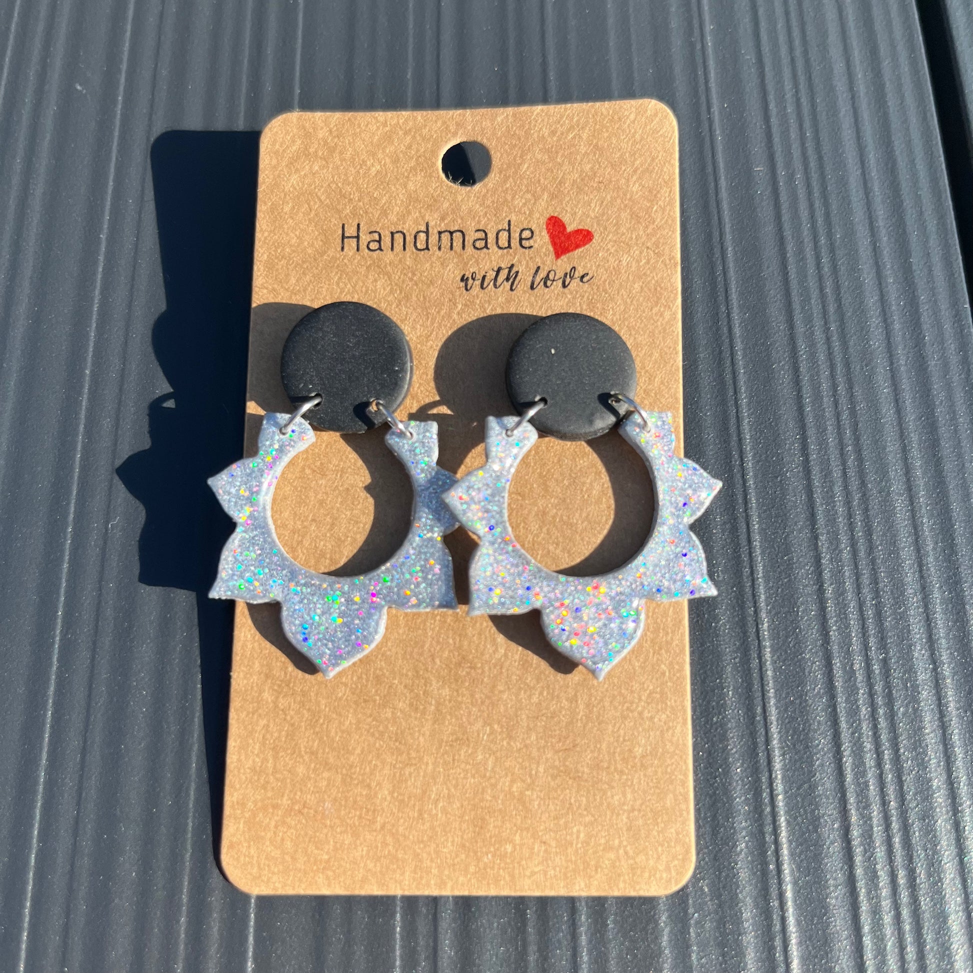 Matériau : argile polymère pailletée. Finition en résine. Clous d'oreille en argent.