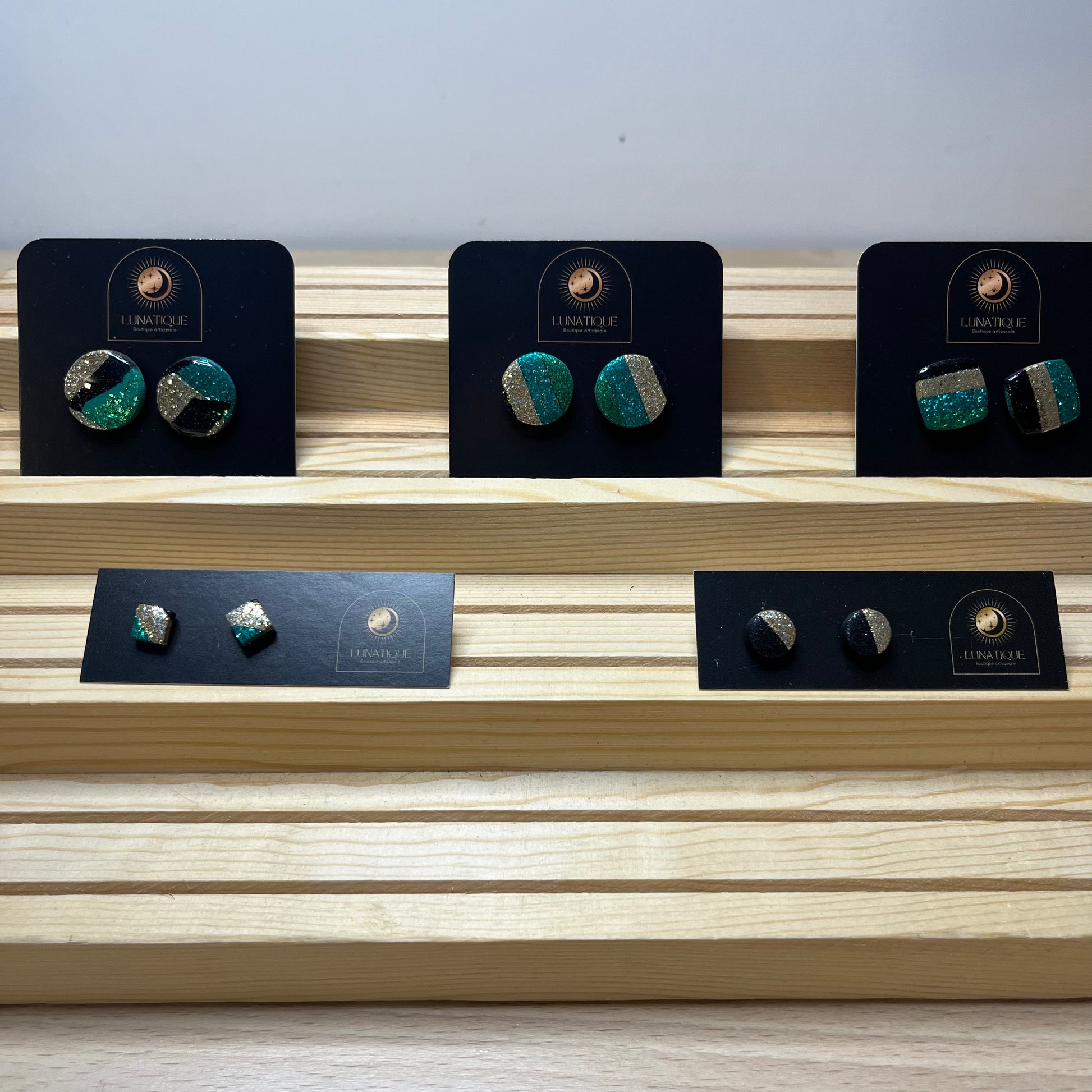 Matériau : argile polymère, finition paillettes, clous d'oreille dorés à l'or fin.