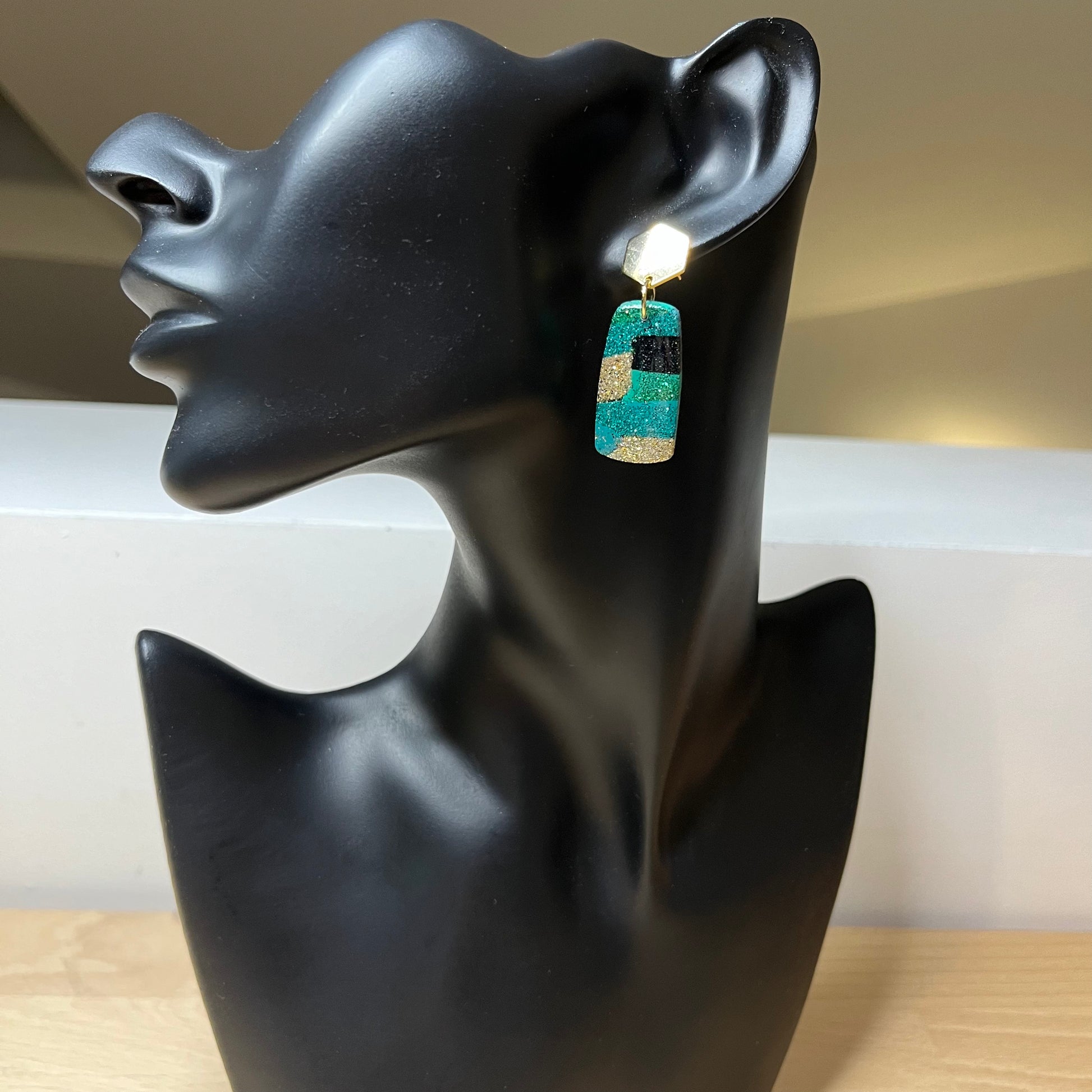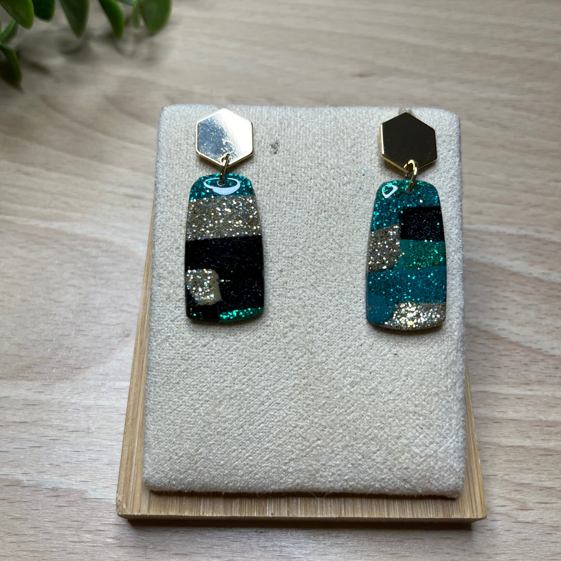 Matériau : argile polymère, finition paillettes et résine, clous d'oreille dorés à l'or fin.